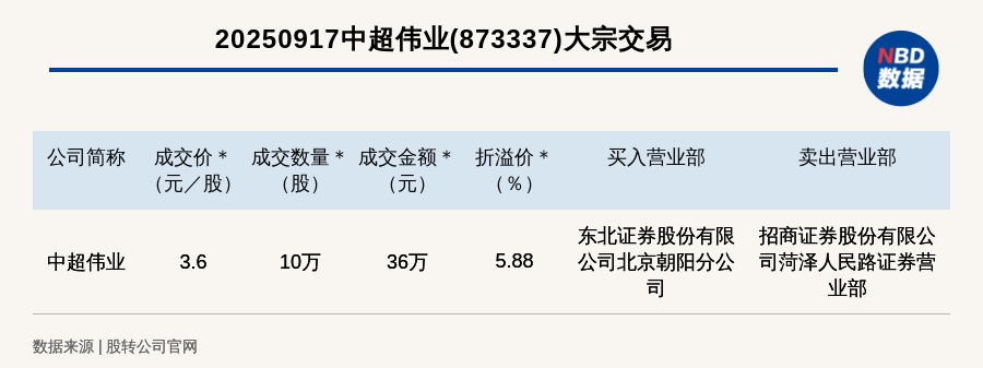 每經(jīng)訊,2025年9月17日,新三板創(chuàng)新層公司中超偉業(yè)(873337,收盤價:3.4元)發(fā)生一筆大宗交易,成交價3.6元/股,成交數(shù)量10萬股,成交金額36萬元,溢價5.88%。買入營業(yè)部是東北證券股份有限公司北京朝陽分公司,賣出營業(yè)部是招商證券股份有限公司菏澤人民路證券營業(yè)部。