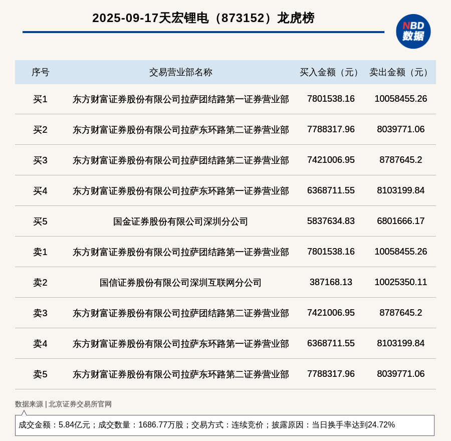 每經(jīng)訊,2025年9月17日,北交所上市公司天宏鋰電(873152,收盤價:34.25元)登上龍虎榜,交易方式是連續(xù)競價,披露原因是當(dāng)日換手率達(dá)到24.72%,成交數(shù)量1686.77萬股,成交金額5.84億元。買一席位為東方財富證券股份有限公司拉薩團(tuán)結(jié)路第一證券營業(yè)部,買入780.15萬元;賣一席位為東方財富證券股份有限公司拉薩團(tuán)結(jié)路第一證券營業(yè)部,賣出1005.85萬元。