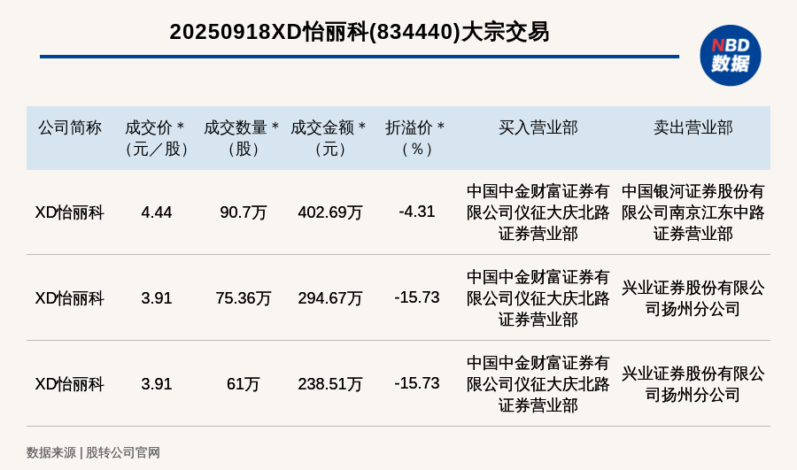 每經(jīng)訊,2025年9月18日,新三板創(chuàng)新層公司XD怡麗科(834440,收盤價:4.64元)發(fā)生3筆大宗交易,總成交金額為935.87萬元,成交金額最高的一筆成交價4.44元/股,成交數(shù)量90.7萬股,成交金額402.69萬元,折價4.31%。買入營業(yè)部是中國中金財富證券有限公司儀征大慶北路證券營業(yè)部,賣出營業(yè)部是中國銀河證券股份有限公司南京江東中路證券營業(yè)部。
