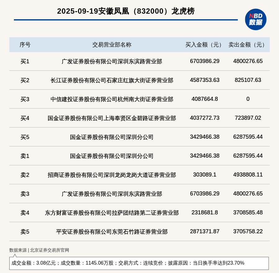 每經(jīng)訊,2025年9月19日,北交所上市公司安徽鳳凰(832000,收盤價(jià):25.75元)登上龍虎榜,交易方式是連續(xù)競(jìng)價(jià),披露原因是當(dāng)日換手率達(dá)到23.70%,成交數(shù)量1145.06萬(wàn)股,成交金額3.08億元。買一席位為廣發(fā)證券股份有限公司深圳東濱路營(yíng)業(yè)部,買入670.4萬(wàn)元;賣一席位為國(guó)金證券股份有限公司深圳分公司,賣出628.76萬(wàn)元。