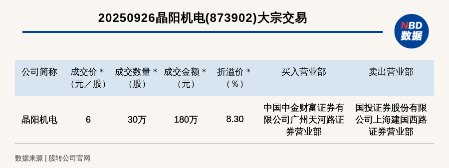每經(jīng)訊,2025年9月26日,新三板創(chuàng)新層公司晶陽機(jī)電(873902,收盤價(jià):5.54元)發(fā)生一筆大宗交易,成交價(jià)6元/股,成交數(shù)量30萬股,成交金額180萬元,溢價(jià)8.3%。買入營業(yè)部是中國中金財(cái)富證券有限公司廣州天河路證券營業(yè)部,賣出營業(yè)部是國投證券股份有限公司上海建國西路證券營業(yè)部。