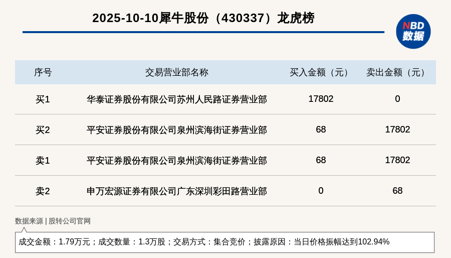 每經(jīng)訊,2025年10月10日,新三板基礎(chǔ)層公司犀牛股份(430337,收盤價:0.68元)登上龍虎榜,交易方式是集合競價,披露原因是當(dāng)日價格振幅達(dá)到102.94%,成交數(shù)量1.3萬股,成交金額1.79萬元。買一席位為華泰證券股份有限公司蘇州人民路證券營業(yè)部,買入1.78萬元;賣一席位為平安證券股份有限公司泉州濱海街證券營業(yè)部,賣出1.78萬元。