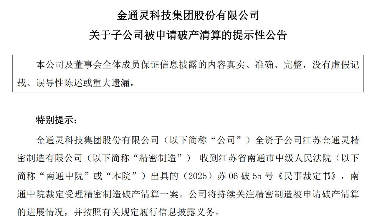 金通靈在10月22日晚的公告中稱,精密制造被其債務(wù)方向法院申請了破產(chǎn)清算。原因是:2024年7月,神光公司與精密制造公司簽訂了《工礦產(chǎn)品合同》,約定由神光公司向精密制造提供加工鏜銑床墩子服務(wù)。2024年8月,神光公司依約向精密制造公司送貨,并開具了介貨單、增值稅專用發(fā)票。但精密制造僅于今年1月通過電子銀行承兌匯票的方式支付了2萬元,剩余款項并未支付。