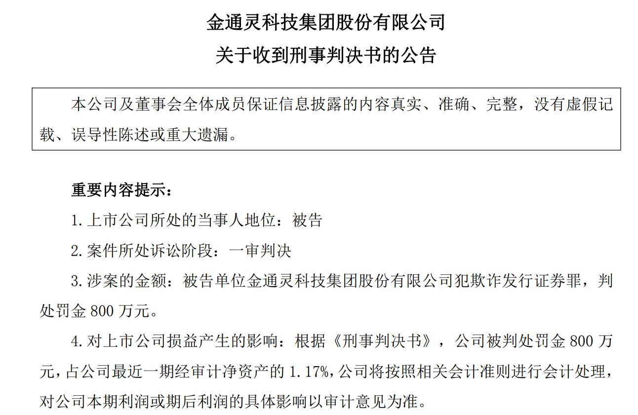 就在不久前的9月30日,金通靈宣布,公司收到上海市第三中級人民法院出具的《刑事判決書》,金通靈因犯欺詐發(fā)行證券罪,一審被判處罰金800萬元;此外,金通靈時任董事長、前實際控制人季偉因犯違規(guī)披露重要信息罪和欺詐發(fā)行證券罪,決定執(zhí)行有期徒刑六年,并處罰金300萬元;袁學(xué)禮、許坤明等其他五名相關(guān)責任人也被分別判處有期徒刑及罰金。