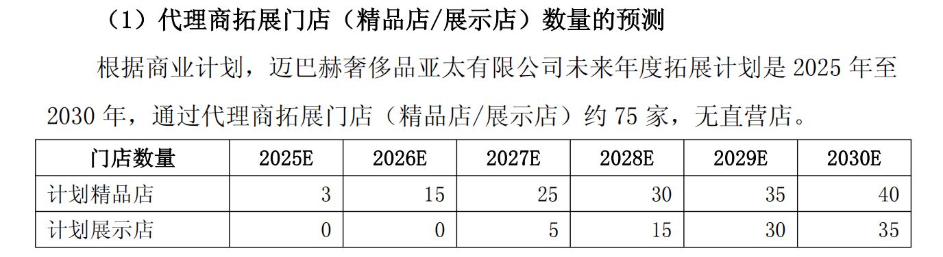 對(duì)此,老鳳祥稱,根據(jù)商業(yè)計(jì)劃,近4年來(lái)邁巴赫奢侈品業(yè)務(wù)年均復(fù)合增長(zhǎng)率為36.5%,業(yè)務(wù)版圖已覆蓋全球75個(gè)國(guó)家和地區(qū),構(gòu)建起由617家零售門店及銷售渠道組成的廣泛網(wǎng)絡(luò),同時(shí)擁有十余家精品旗艦店。其中,在亞太地區(qū)已經(jīng)開設(shè)了6家邁巴赫奢侈品高端精品店,上述店鋪近2年(2023年~2024年)向邁巴赫奢侈品有限公司(MIOL)的平均每家進(jìn)貨額高于200萬(wàn)美元。MAP計(jì)劃6年內(nèi)(2025年~2030年),通過(guò)代理商拓展75家門店。