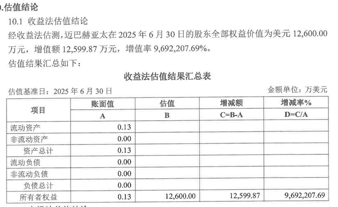 《每日經(jīng)濟(jì)新聞》記者注意到,10月9日發(fā)布的《上海老鳳祥有限公司擬通過(guò)控股子公司增資所涉及的邁巴赫奢侈品亞太有限公司股東全部權(quán)益價(jià)值估值報(bào)告》(以下簡(jiǎn)稱《估值報(bào)告》)就曾提及,經(jīng)收益法估算,邁巴赫亞太在2025年6月30日的股東全部權(quán)益價(jià)值為1.26億美元,增值額約1.26億美元,增值率9692207.69%;經(jīng)市場(chǎng)法估測(cè),邁巴赫亞太在2025年6月30日的股東全部權(quán)益價(jià)值為1.32億美元,增值額約1.32億美元,增值率10153746.15%。收益法與市場(chǎng)法估算后,存在600萬(wàn)美元的價(jià)差,差異率4.76%。