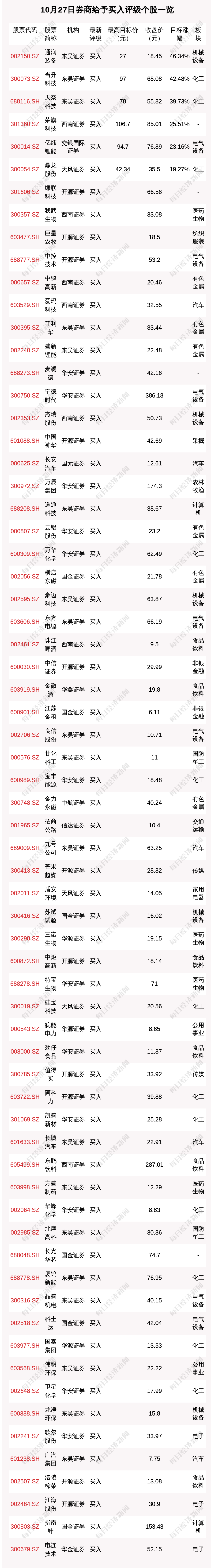 每經(jīng)AI快訊,10月27日,券商給予評級的個股數(shù)共有128只,獲得買入評級的個股數(shù)共有67只。在公布了目標價格的6只個股中,按照最新收盤價計算,預期漲幅排名居前的個股是通潤裝備(002150.SZ)、當升科技(300073.SZ)、天奈科技(688116.SH),預期漲幅分別是46.34%、42.48%、39.73%。